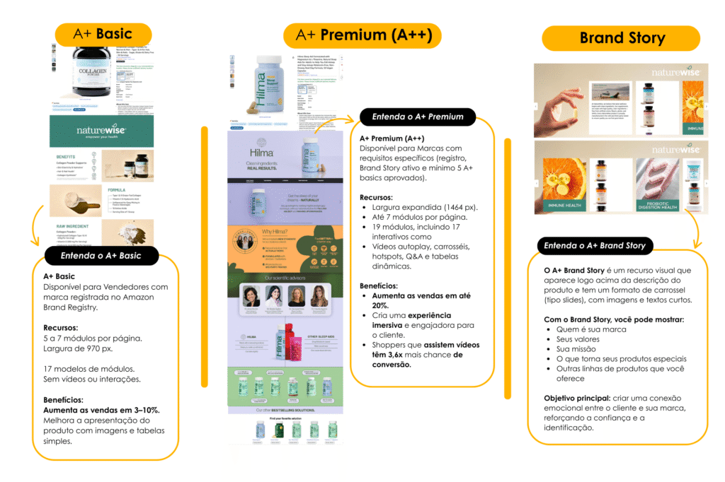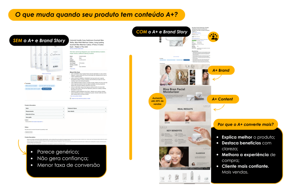 O A+ Brand Story é um recurso visual que aparece logo acima da descrição do produto e tem um formato de carrossel (tipo slides), com imagens e textos curtos.